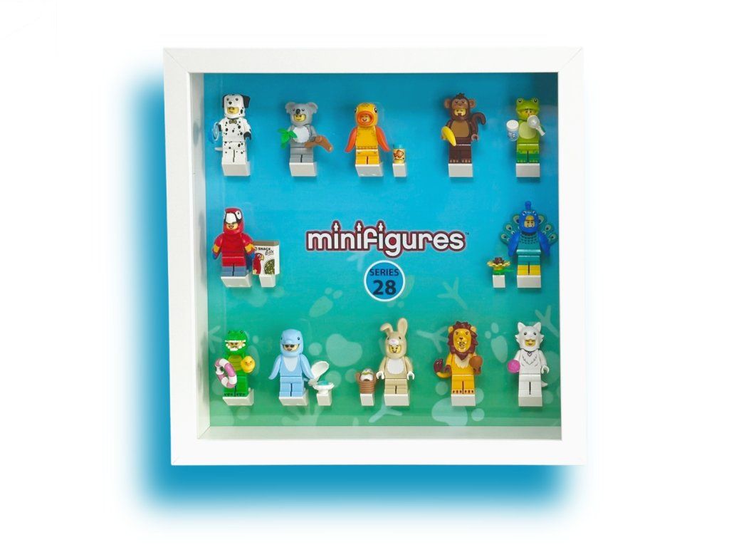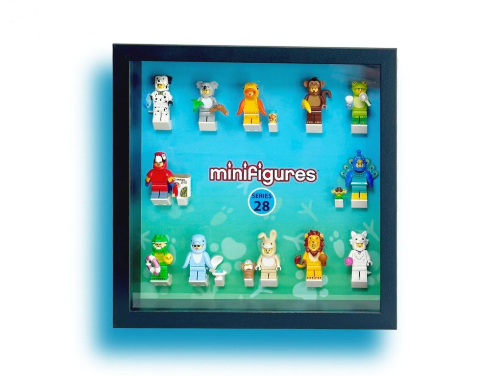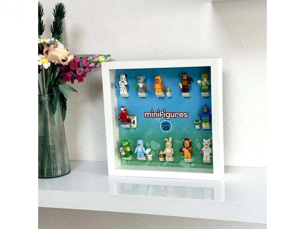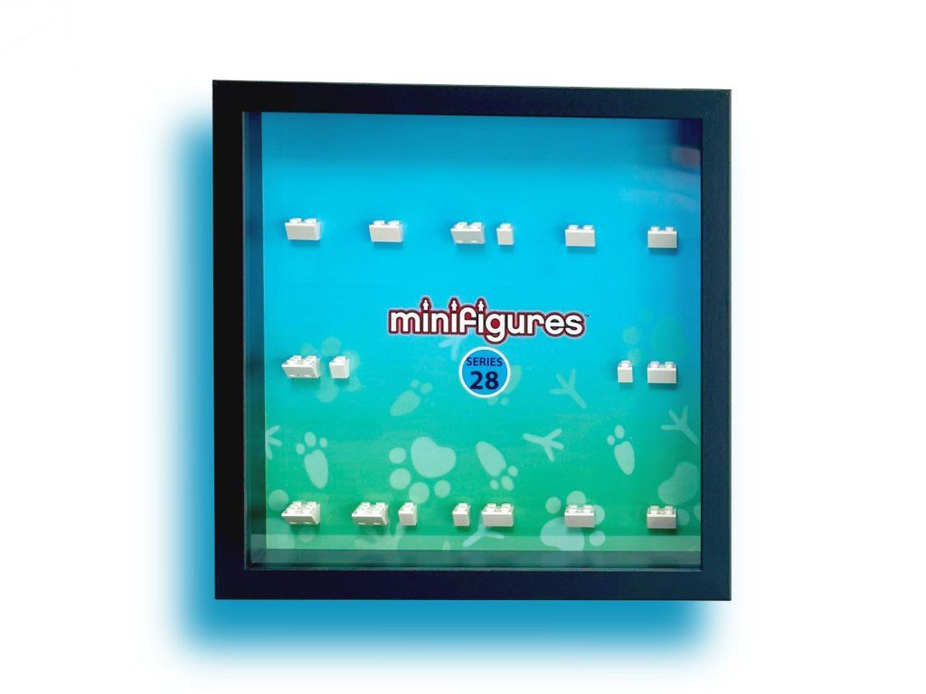 Uvnitř je potištěné pozadí navržené speciálně pro LEGO minifigurky Series 28 - 71051, včetně připravených pozic pro všechny figurky i jejich doplňky – stačí je jen nacvaknout na originální LEGO kostky a rám je okamžitě připraven k vystavení. Plastové krycí sklo chrání model před prachem a zároveň minimalizuje riziko rozbití oproti klasickému sklu, takže je vhodné i do dětských pokojů.